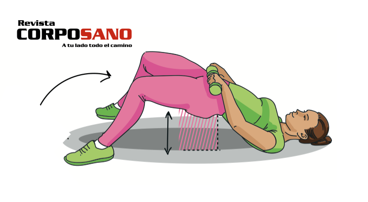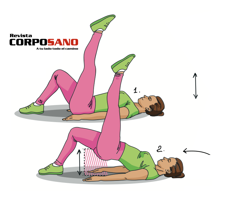 Ejercicio 1: Elevación de cadera – Recuéstate de espaldas en el piso, tus pies deben de estar ligeramente separados. Eleva tu cadera al mismo tiempo que contraes los músculos de tus glúteos. Mantén esta posición por un minuto y regresa al piso, repite el movimiento.