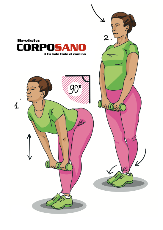 Ejercicio 4: Peso muerto – De pie, con tus pies entrelazados, toma una mancuerna (del peso que tu consideres) con tus dos manos. Inclina tu cuerpo formando un ángulo de 90 grados y regresa a la posición inicial.