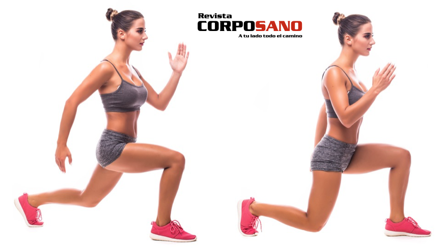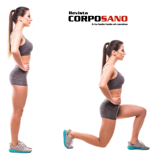 EJERCICIO 1 – Zancadas (lunges): Colócate de pie con la espalda recta y los pies separados ligeramente. Lleva tu pierna derecha hacia adelante cuidando de que forme un ángulo de 90 grados y con la izquierda separando el talón ligeramente. No olvides que no debes de arquear tu espalda. Para cuidar tus rodillas, la zancada no debe de ser muy larga para no ejercer presión en las rodillas. Alterna pierna derecha e izquierda.