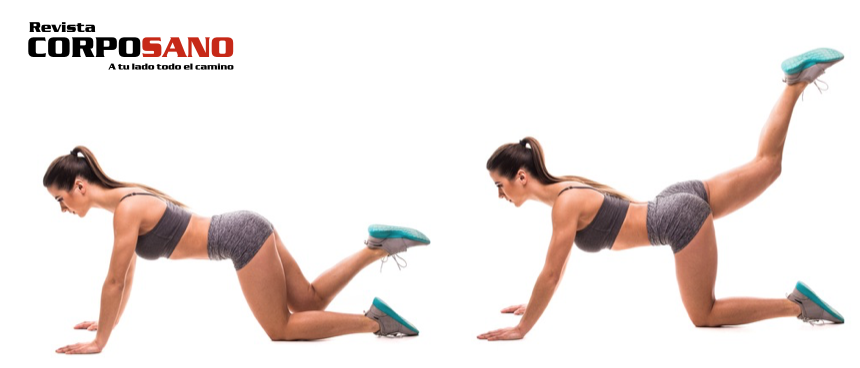 EJERCICIO 2 – Patada de glúteo: Colócate sobre una superficie suave, apoyando manos y rodillas y con la espalda recta. Lleva tu pierna derecha hacia atrás, cuidando de no arquear la espalda. Regresa a la posición original. Alterna pierna derecha e izquierda. Puedes utilizar peso en los tobillos para aumentar el trabajo de los glúteos.