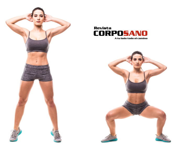 EJERCICIO 4 – Saltos de rana: Colócate de pie con la piernas separadas, las puntas de los pies hacia afuera y las manos detrás de la cabeza, como su fueras a realizar una sentadilla, colócate en cuclillas y da un salto corto con los dos pies, impulsándote hacia arriba y suavemente realiza a la posición de cuclillas. Realiza varios saltos cortos (recuerda que los saltos tienen que ser cortos y siempre manteniendo las rodillas ligeramente flexionadas).