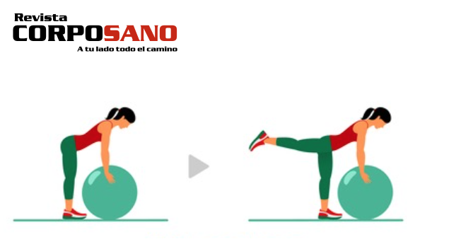 Ejercicio 1: Patada de glúteo: Colócate de pie con la pelota en el suelo. Recarga tus manos en ella, con los brazos estirados de manera vertical, espalda recta. Lleva tu pierna derecha completamente estirada hacia atrás (mantén esta posición unos segundos y regrésala al piso). Alterna tu pierna derecha con la izquierda.