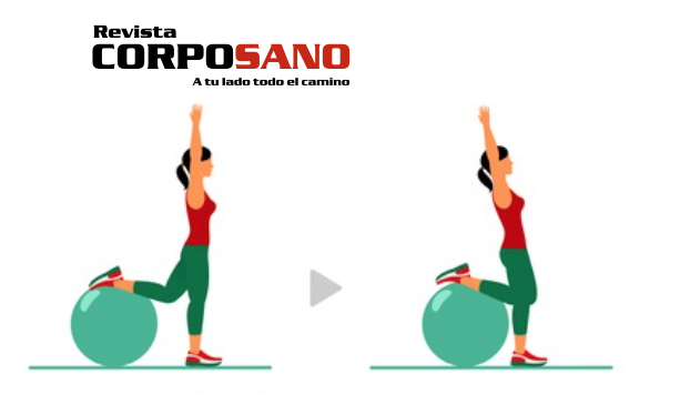 Ejercicio 2: Tensor de glúteo: Nuevamente de pie, coloca la pelota detrás de ti. Sube tu pie derecho, doblando la rodilla. Lleva tus brazos arriba de tu cabeza. Ahora con tus manos toca tu pie izquierdo y regresa a la posición inicial. Debes de mantener tu pierna derecha arriba de la pelota, manteniendo el equilibrio y siempre apretando tus glúteos y abdomen.