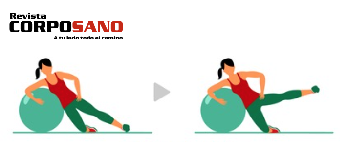 Ejercicio 4: Elevación lateral: Tus rodilla en el piso, recarga tu costado derecho en la pelota. Eleva de manera lateral tu pierna izquierda, manteniendo el equilibrio y tensando tus glúteos. Regresa a la posición inicial.