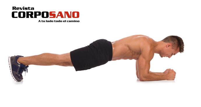 Ejercicio 1: Plancha con codos apoyados. La plancha es un ejercicio que actualmente se ha popularizado. Trabajas muchos grupos musculares, entre ellos, la zona abdominal. Colócate boca abajo, con tus brazos apoyados en el suelo formando un ángulo de 90 grados, tus piernas estiradas, tus pies ligeramente separados, apoyando las puntas en el suelo. Eleva tu cuerpo, contrayendo tu abdomen, espalda recta alineada con tu cuello.