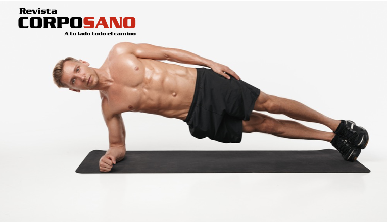 Ejercicio 4: Plancha lateral. Colócate de lado, con tu brazo derecho recargado sobre el piso, las piernas estiradas y los pies juntos. Eleva tu cuerpo, formando una línea recta. Mantente en esta posición, contrayendo tus músculos abdominales. Baja las caderas lentamente.