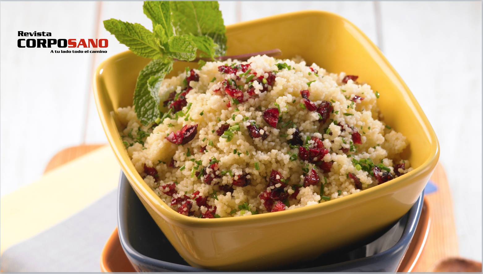 Coloque el cuscús en un recipiente y agregue el cebollín y los arándanos; bañe con el aderezo. Al servir adorne con las ramas de menta