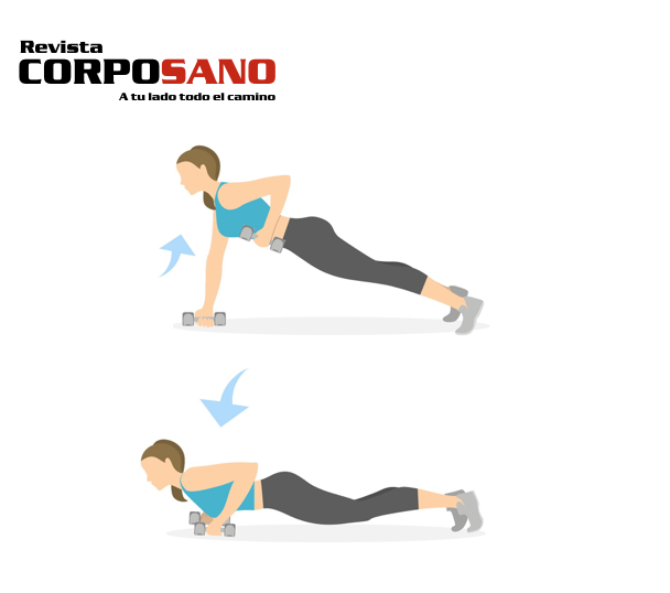 Ejercicio 1: Lagartija con mancuerna. Colócate boca abajo, toma una mancuerna en cada una de tus manos Eleva tu tronco manteniendo una línea recta desde tu cuello hasta tus pies. Una vez que estés con el tronco elevado, eleva tu brazo derecho hacia un lado, manteniendo tu cuerpo solo con la fuerza del abdomen y tu brazo izquierdo, baja lentamente. Alterna brazo izquierdo y derecho.