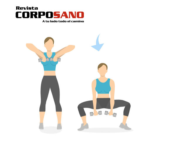 Ejercicio 2: Sentadilla con pesas. En este ejercicio, trabajarás tus piernas y glúteos, así como tus brazos. Colócate de pie, con las piernas ligeramente separadas, toma unas mancuernas en tus manos y eleva tus brazos, cuando los bajes, al mismo tiempo debes de bajar tu tronco, realizando una sentadilla. Repite el movimiento, primero elevando tus brazos y luego bajando tu cuerpo.