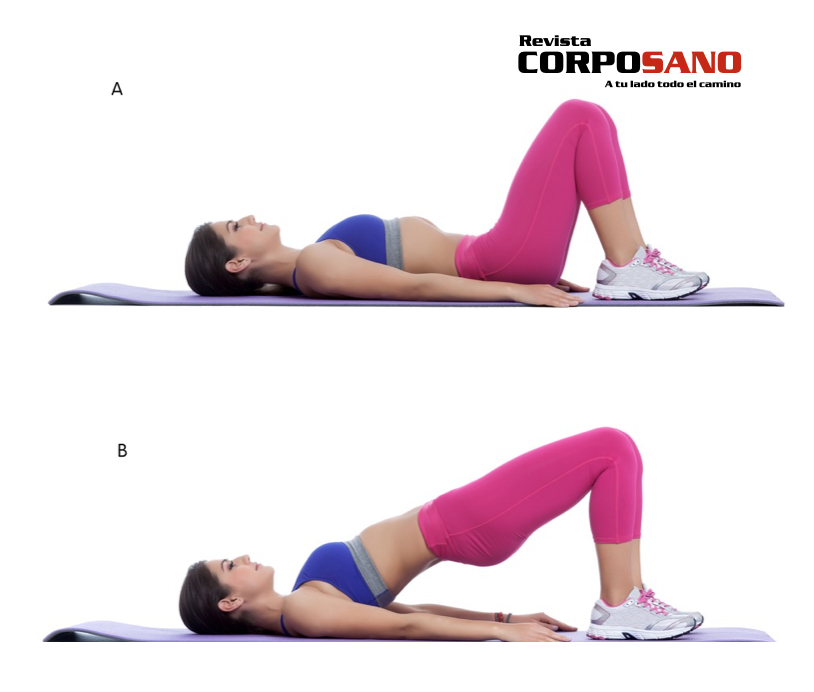 Elevación de cadera o puente. Acostada boca arriba sobre un tapete, coloca tus brazos a un lado de tu cuerpo, las piernas dobladas en un ángulo de 90 grados. Eleva cuidadosamente tu tronco, al mismo tiempo que contraes tus glúteos y cuidando que la fuerza venga del abdomen y no del cuello o espalda. Mantén esta postura por un minuto y regresa tu cuerpo al piso. Vuelve a repetir el movimiento.
