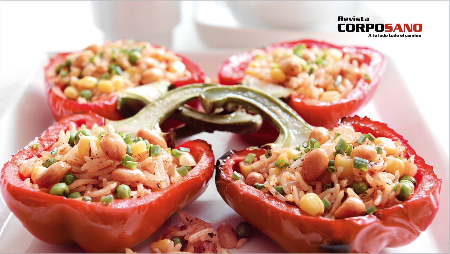Precaliente el horno a 200º C. Corte a lo largo los pimientos en mitades, retire las semillas y las partes blancas sin retirar el rabo. Rocíe una cucharada de aceite y hornee en el horno durante 20 minutos. Cocine el arroz como lo indican las instrucciones del empaque. Escurra y manténgalo en espera. Caliente una cucharada de aceite en una sartén y cocine la cebolla hasta que adquiera una textura suave, sin que se dore. Agregue el ajo y cocine durante dos minutos. Enseguida, agregue las hierbas y la páprika, deje cocinar otro minuto. Añada los chícharos, los elotes, los cacahuates y el arroz. Mezcle bien y sazone con pimienta y jugo de limón al gusto. Distribuya la mezcla entre las mitades de pimiento y vuelva a hornear durante 10 minutos. Sirva y espolvoree los cebollines junto con una cucharada de tzatziki.