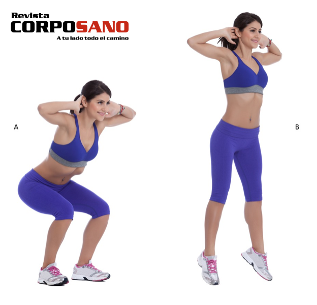 Ejercicio 1: Sentadillas con salto. Colócate de pie, con los pies separados a la altura de tus caderas, como si fueras a realizar una sentadilla, tienes que bajar tu cuerpo, cuidando que tu tronco esté recto. Cuando ya hiciste la sentadilla, ahora tienes que impulsarte hacia arriba de un salto, separando tus pies del suelo. Regresa a realizar la sentadilla y vuelve a repetir el salto.
