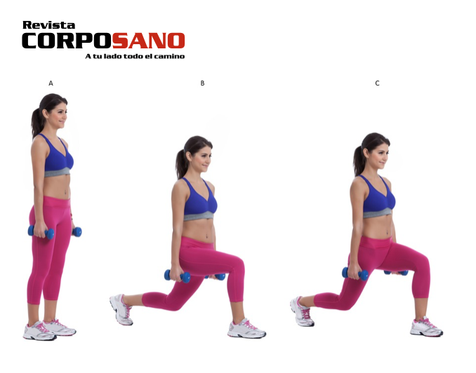 Ejercicio 2: Lunge (desplantes) con mancuerna. De pie con tus piernas separadas a la altura de tus hombros. Toma unas mancuernas en cada una de tus manos. Da un paso al frente con tu pierna derecha, flexionando tu rodilla hasta que forme un ángulo de 90 grados. Regresa a la posición inicial y alterna tu pierna derecha e izquierda.