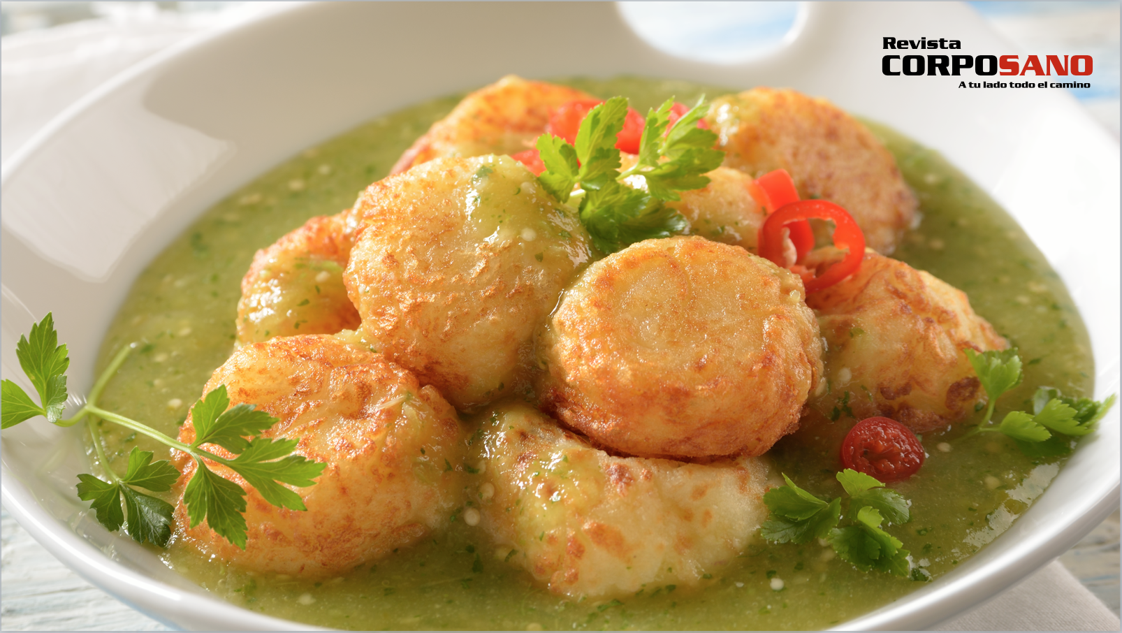 Prepare el pure de papa de acuerdo a las instruciones en el empaque; deje enfriar. Agregar la fécula de maíz, la yema de huevo, sal y pimienta al gusto. Forme tortitas y rellenelas con el chorizo. Una vez formadas las tortitas, enharínelas ligeramente y fríalas en aceite caliente, aproximadamente tres minutos por lado o hasta que estén doradas. Caliente la salsa verde y bañe las tortitas.
